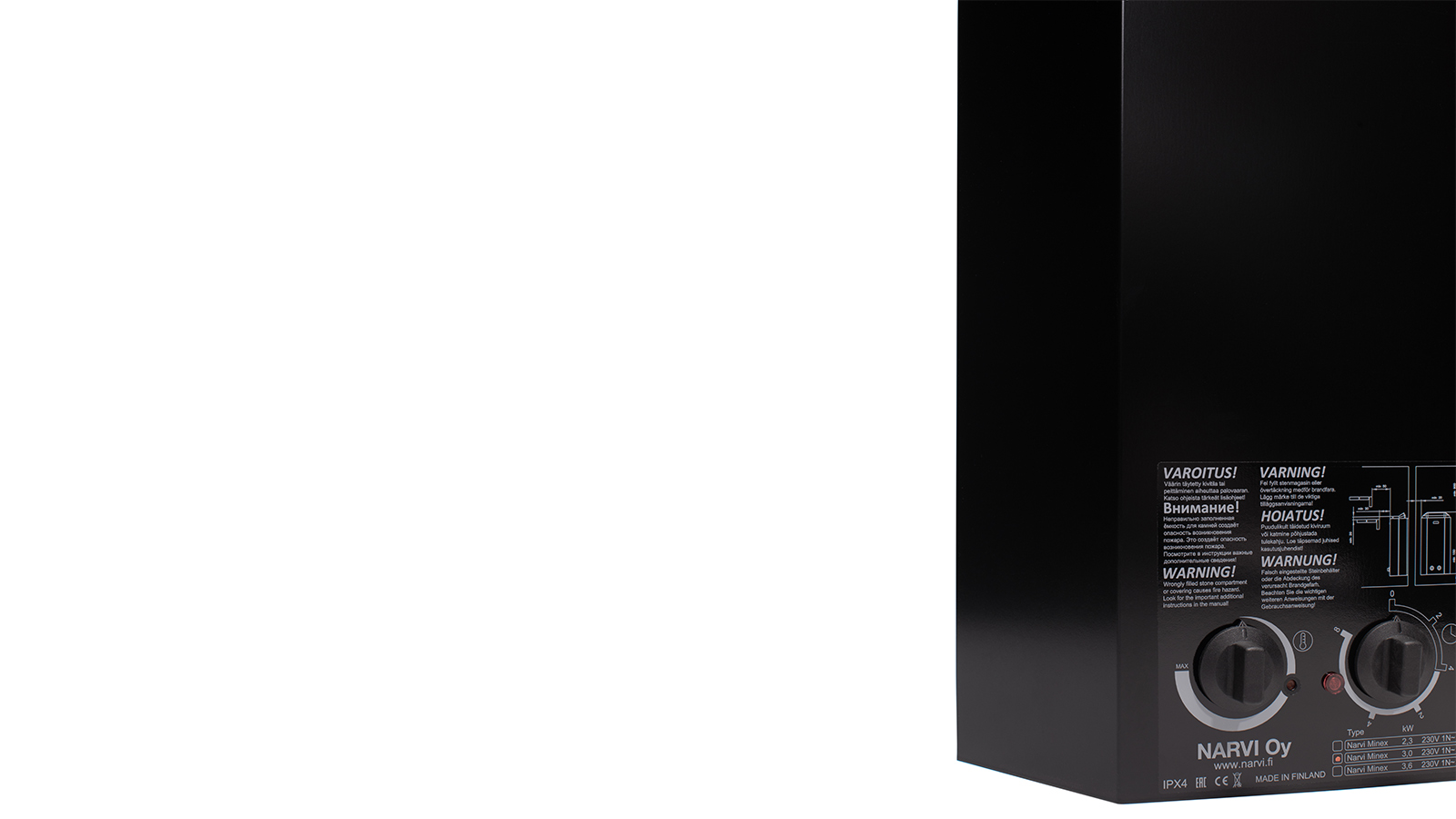 Le poêle pour sauna Narvi Minex peut être piloté via ses interrupteurs intégrées ou via un panneau de contrôle (en option) pour plus de confort et de flexibilité.